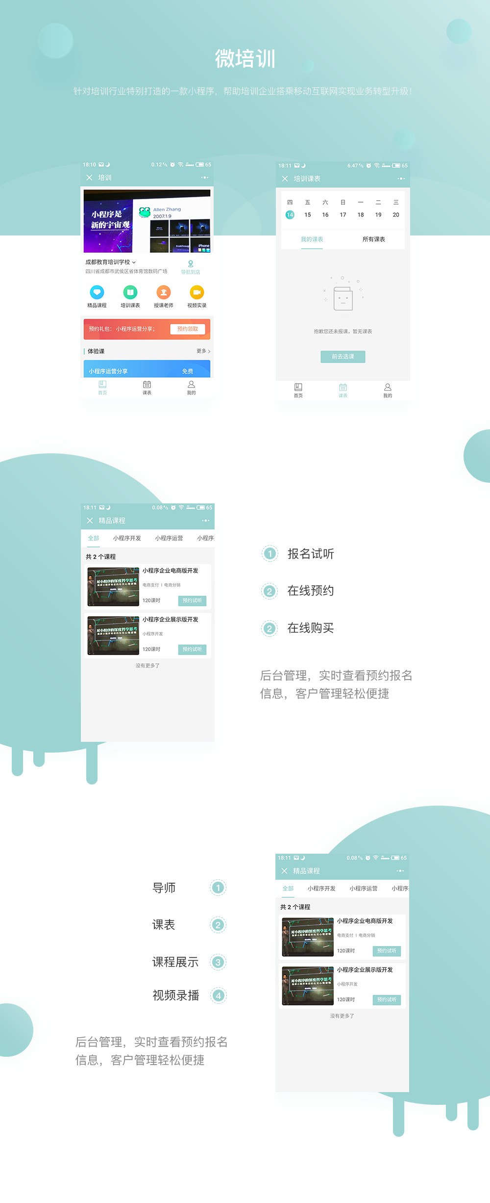 培训教育模块针对线下培训行业量身定制,支持课程预约和报名购买,支持课堂实录展示授课风格,支持课表预约等,通过线上分享传播,报名预约,支付购买转接线下培训服务,帮助培训企业借助移动互联网实现业务转型升级!