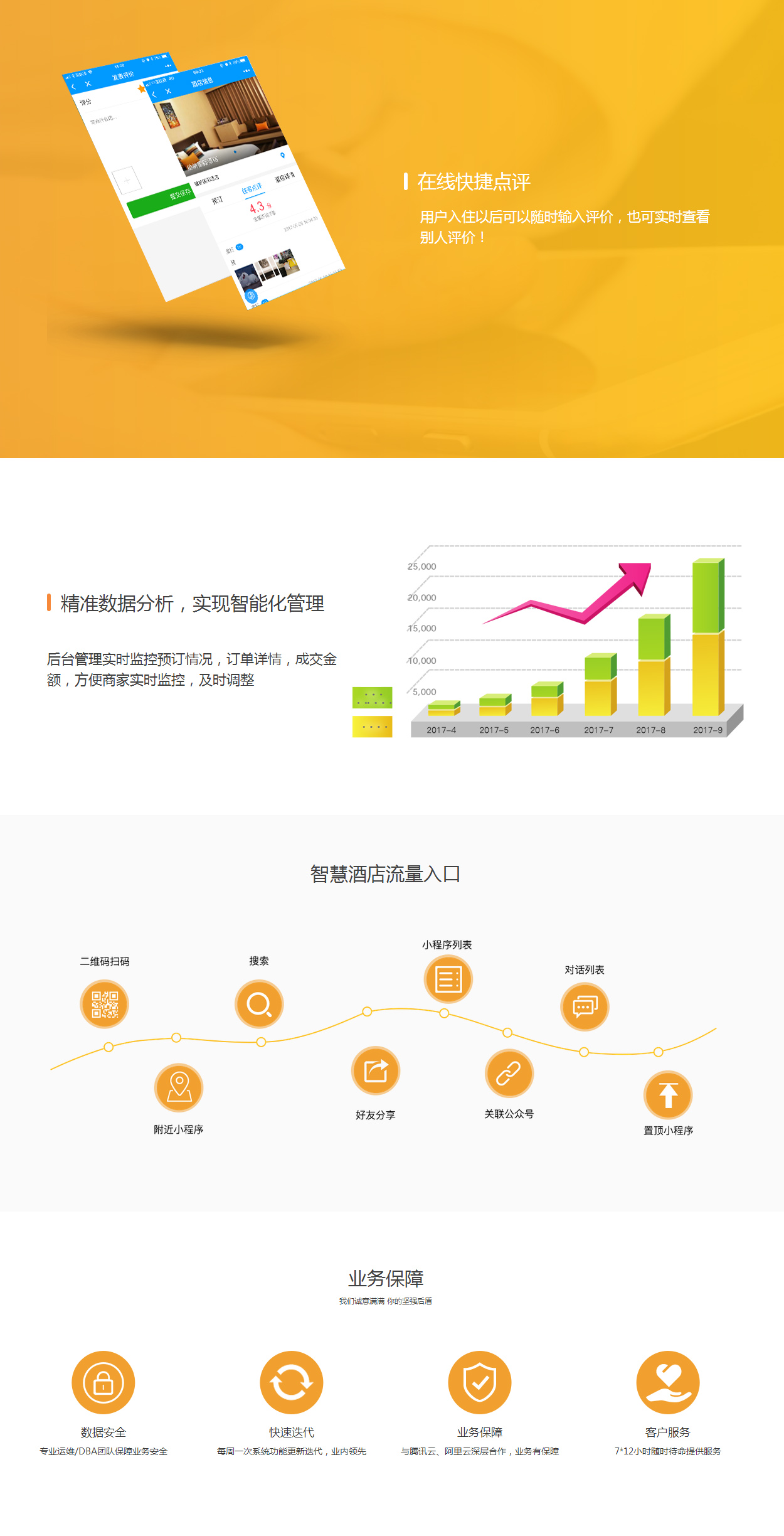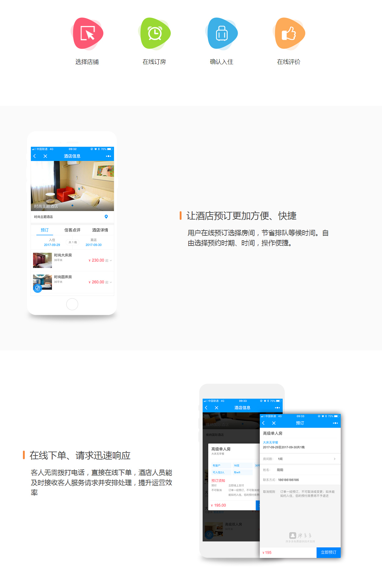酒店预订模块是小程序在酒店行业的应用,传统酒店预约依赖电话与平台,现在小程序酒店预约来临,用户可以直接通过小程序在线上进行酒店预订,方便快捷,同时店家可以通过附近的小程序功能,起到引流作用。该模块分为单店版和多店版。