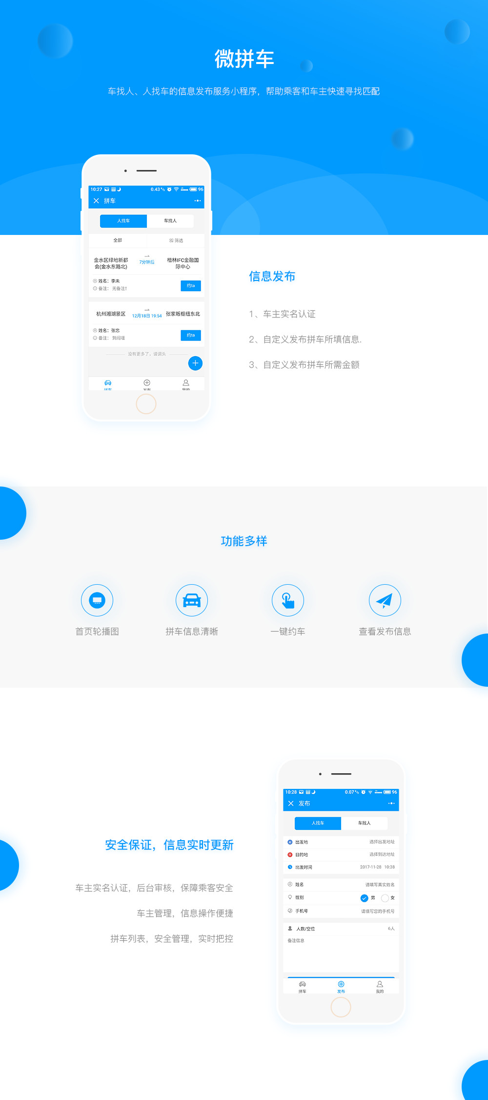 拼车模块分车找人和人找车两种模式,支持司机与乘,互相发布乘车/载客需求,用户输入自己的具体位置和目的地,将信息提交后,小程序会将发布信息上传至平台,寻找相匹配的私家车或者乘客。