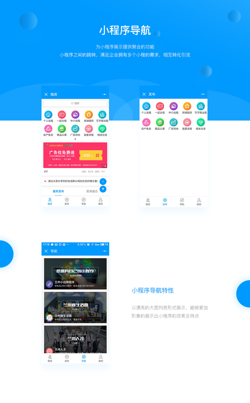 小程序导导航模块为小程序展示提供了聚合的功能。他以漂亮的大图列表形式展示,能够更加形象的展示出小程序的效果及特点。这个模块支持小程序之间的互相跳转,为互联网类的科技公司提供了便捷的案例展示的平台。同时也为传统行业提供了本公司所有小程序集合的一个页面,更便于让浏览者浏览公司下相关所有的小程序。