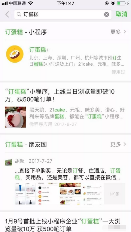 而小程序的名称是唯一的,假设您注册了“订蛋糕”这个名称,别人就无法再注册。基于此,商家必须根据用户的搜索习惯和产品特性,尽可能多地注册小程序名称,才更有可能被用户搜索到。