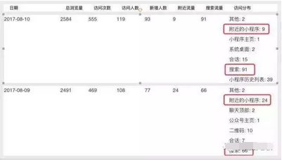 e足疗数据后台也显示出这些顾客的来源主要分为两大类:客户主动搜索关键字和微信提供的附近的小程序功能。