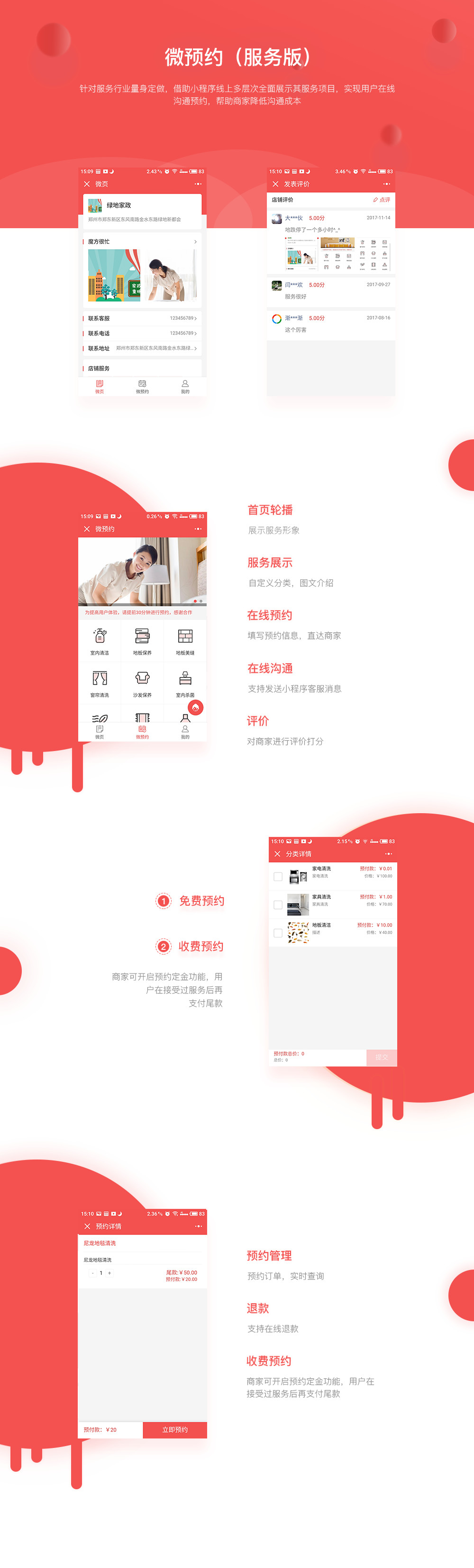 预约模块是为服务行业量身定做的模块,线下实体店可以在线上多层次全面展示服务项目,用户可以直接在线上进行服务预约并支付订金。服务结束后,用户可以对服务进行评价和打分。
